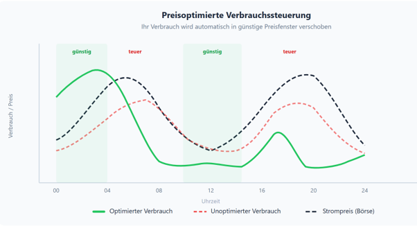 - Eigenverbrauchsoptimierung: Wenn Du eine PV-Anlage besitzt, wird dein Eigenverbrauch maximiert. Du beziehst damit weniger Strom vom Netz.